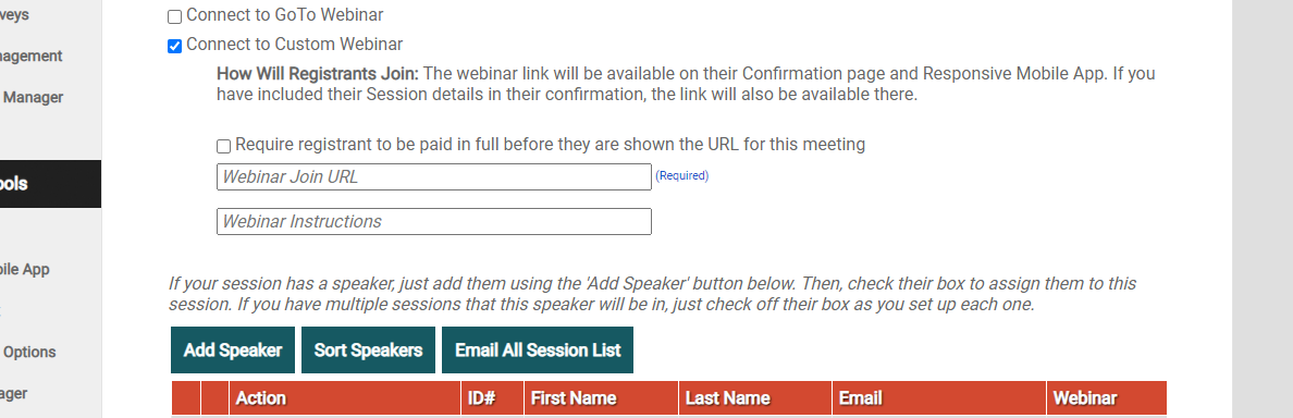 Go to the Sessions tab under Set-up -> Registration Form. As you edit your sessions, you have an option to Connect to Custom Webinar. Simply fill in the Join URL provided to you by the service. You can also include details such as Passwords in the Webinar Instructions.
