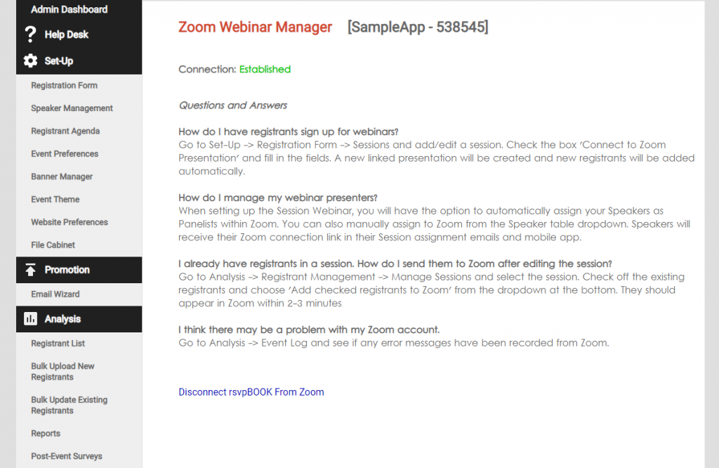 To disconnect rsvpBOOK from your account, simply return to the Zoom Webinar Manager under the Integrations menu. From there, click Disconnect rsvpBOOK from Zoom.